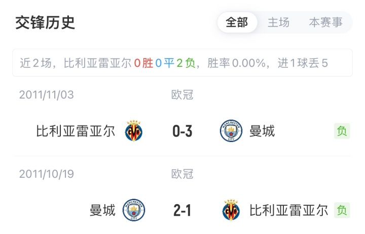 曼城欧冠1胜1平积4分,英超联赛5胜1平2负积16分暂位第2,各项赛事连续7场不败;比利亚雷亚尔欧冠1平1负积1分,西甲联赛5胜2平2负积17分暂位第3,各项赛事连续3场不胜。曼城历史对阵比利亚雷亚尔2场全胜。