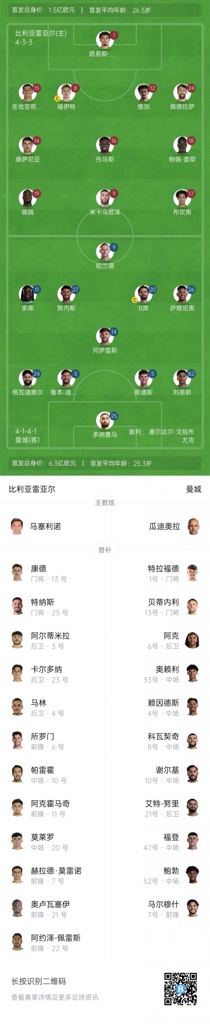 比利亚雷亚尔替补:13-康德、25-特纳斯、3-阿尔蒂米拉、23-卡尔多纳、4-马林、6-所罗门、10-帕雷霍、11-阿克霍马奇、20-莫莱罗、7-赫拉德·莫雷诺、21-奥卢瓦塞伊、22-阿约泽·佩雷斯